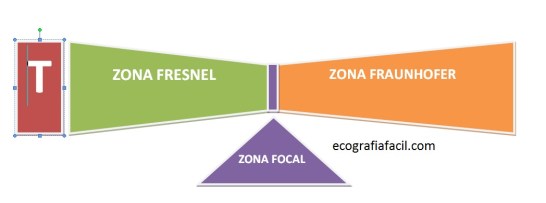 Zona Fresnel o proximal. Cuando el haz sale del transductor (T, en el dibujo), podemos decir que energéticamente es heterogéneo, es decir, tiene interferencias debido a que no todas las ondas producidas en el transductor tienen exactamente la misma frecuencia o pueden tenerla, pero con distinta fase y pueden anularse en este caso. Si tienen la misma frecuencia, estas interacción entre las diferentes ondas puede ser constructiva y destructivas si estuvieran desfasadas y se anulasen, como ya hemos contado.
