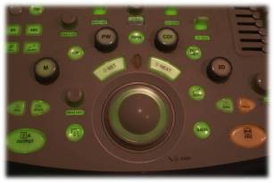It usually has a main aspect in the keypad, it is usually bigger and more striking, it will be centered or slightly pulled to the right, always close to the trackball. As we see in the three previous images of three different brands. When we freeze the image we not only stop the image on the screen, we also make the transducer glasses stand still and therefore stop working, a very important issue for its lasting conservation, we strongly recommend that when the equipment is not being used, example, between patient and patient, that the freezer is activated (stop image) so that the crystals do not work and the screen does not work either. This function of the freezer is capitalized. It is the button that is most used, easy to understand, because each image that we want to save will activate this function, although sometimes that image is not valid and we have to re-unfreeze it. When our eye sees an image on the screen that we want to save and our brain orders our finger to freeze the image, it takes tenths of a second for the patient, such as a baby, to take advantage of the movement to make the image we want no longer appears on the screen … Why do I tell this? This question comes to mind the second adjustment of today, the cinema … The cinema is a setting that allows reviewing a series of images that the ultrasound system has previously saved before pressing the freezer in order to «rewind» and go back to find the image that my eye had seen, select it and be able to do it. desired picture before the baby of our example had moved … it’s a great fit! In some echographs this adjustment is integrated in the keypad, but other times it is an automatic adjustment that is activated when the freezer button is pressed and it is the trackball that assumes this function. But how many images can I save? Unfortunately we can only save a few hundred images, that is hardly a few seconds before pressing the freezer button since the ultrasound image that we see on the screen is the representation of a large superposition of images that are refreshed automatically, but this question we will address it later.