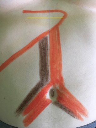 Para ello, dispondremos nuestro transductor en longitudinal o sagital al cuerpo, desde Apéndice Xifoides y en Línea Alba, partiendo del corte axial que realizamos para el estudio de Ramas Izquierdas Portales y lo ejecutamos girando nuestro transductor 90º en sentido horario. En la imagen siguiente pasaríamos de línea amarilla a línea negra girando la sonda 90º hacia la cabeza de la/el paciente. Esta es la imagen: