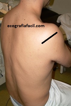 Tocamos la espina escapular, cerca del húmero en el teórico lugar de la inserción del Infraespinoso y colocamos la sonda como os marco en la imagen, siempre debajo de la espina escapular, entonces tienes que buscar estas dos imágenes que te pongo a continuación juntas: