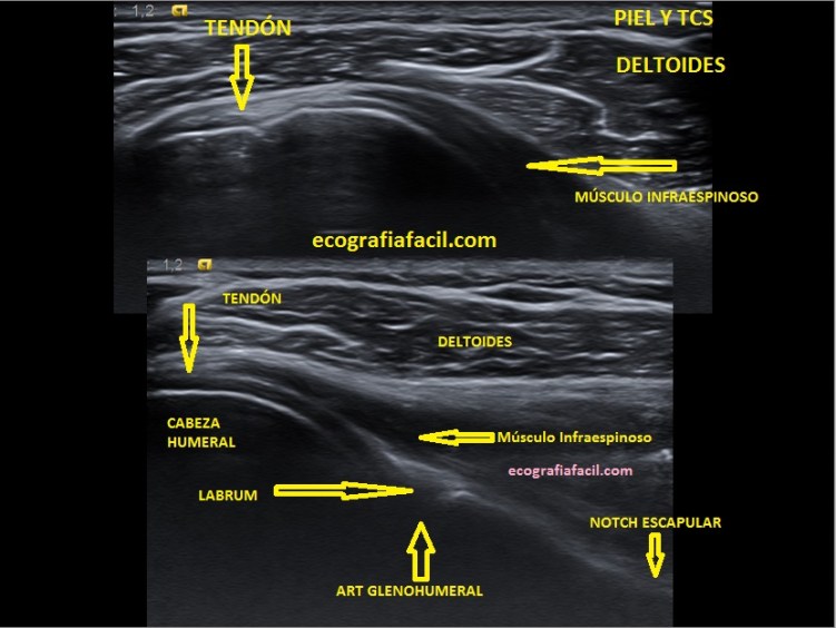 En la imagen ves dos imágenes, la de arriba es justo en la inserción, la de abajo es la imagen que tienes que conseguir para ver y estudiar el Labrum posterior, para eso deberás hacer un recorrido mínimo hacia la columna vertebral siguiendo el eje largo del músculo infraespinoso, sí, es dificil, me encantaría guiarte con la mano, pero de momento nos apañamos así.
