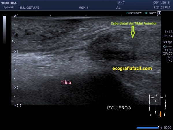 La patología del Tibial Anterior y Posterior tiene que ver mayoritariamente con tendinosis, que ecográficamente se verá hipoecogénica, con líquido, aumento de tamaño, calcios…etc.