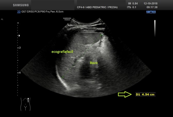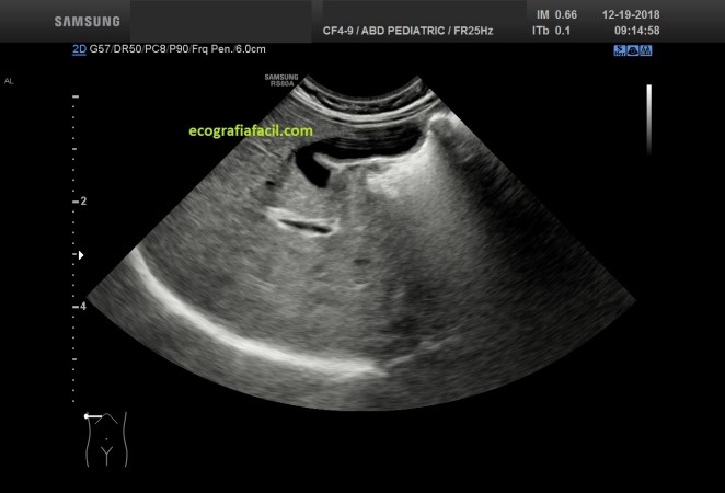 In the liver, the study will be the same as in the adult, exceptions such as the crying of the baby or its non-collaboration can make the study difficult, it is a problem inherent to this plot of the ultrasound. I wanted to highlight the Vesicle, many times we will see it folded, sometimes filiform, for the lack of fasting, also normal.