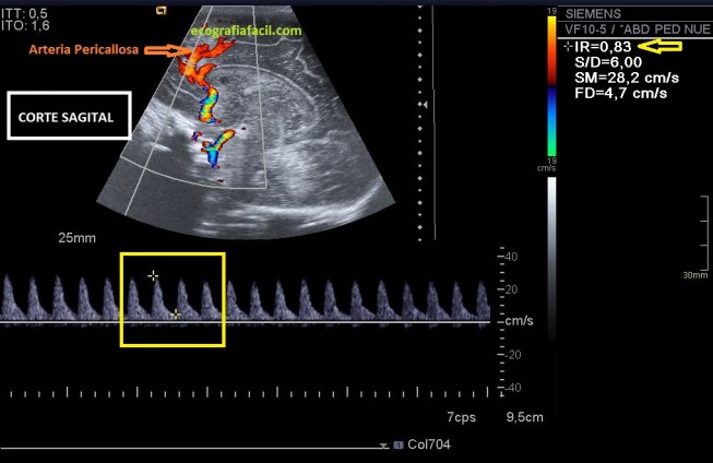 In the study with the Doppler of the neonatal and infant brain we pursue the achievement of a value that will give us the IR or Resistance Index. In this link I leave a summary of the University of Zaragoza where you will understand perfectly the details of the importance of this IR, a value that we calculate using the Doppler Pulsed of two arteries, the Pericallosa Artery (Sagittal Cut) and some of the cerebral arteries , I recommend studying it in Corte Coronal. Both cuts are made through the anterior fontanelle.