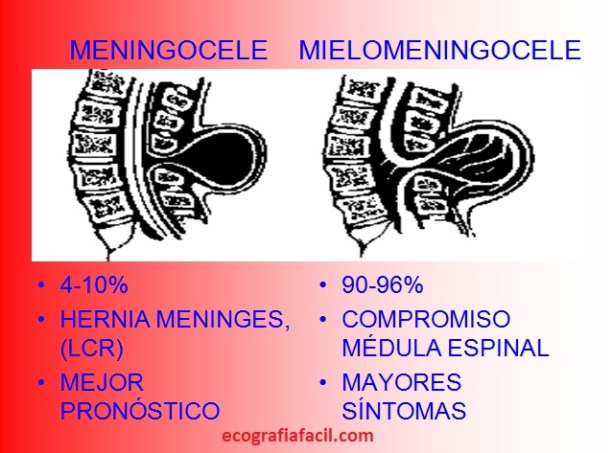 La diferencia de estas dos patologías está en la estructura anatómica que está herniada, meninges o médula, lo cual varía el diagnóstico.