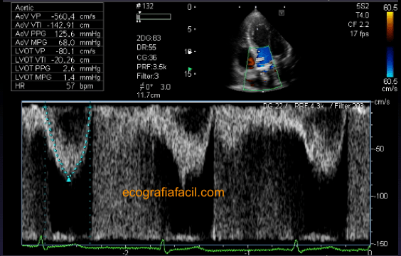 Another measure that we are going to do in this plane will be the calculation of the valvular area for what we rely on in the «continuity equation». For this, we need to take the velocity-time integral in the LV outflow tract (LVOT) with pulsed Doppler (figure 22) and the aortic transvalvular maximum and middle gradients with continuous Doppler (figure 23). By means of these two measurements and the one that we had before the diameter of the LVOT, which we had in the parasternal long axis, we can calculate the area and quantify the degree of severity in case of stenosis.