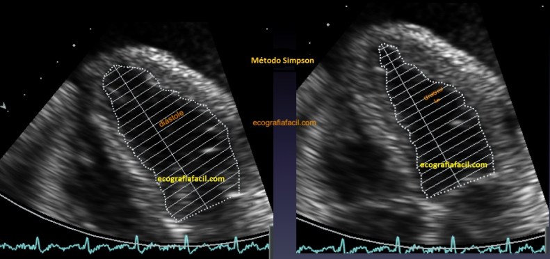 For the assessment of LVEF (ejection fraction of the LV) we have 3 methods: the first one is qualitative and consists of taking a general impression of the global contraction. Remember that below 50% we already talked about depressed LVEF. The second is the Teichold method, consisting of subtracting the diameter of the LV in diastole and systole in the parasternal long axis, which we saw in a previous post. The third is the Simpson biplane method, for which we need to obtain the VI area in the 4 chambers view and in the 2 chambers view (figure 25). The team will make their accounts to offer us a numerical valuation. All the data we obtain from the 3 methods should not be discrepant with each other although there are slight variations. If we obtain a visual LVEF and Teich 65% and the Simpson method tells us 30%, obviously something is wrong.