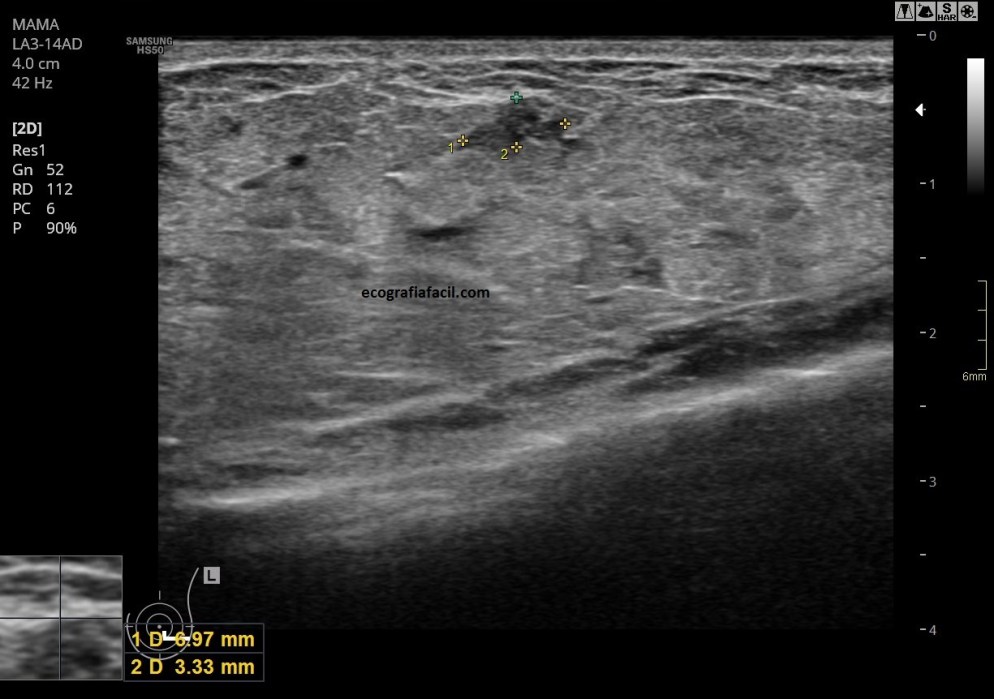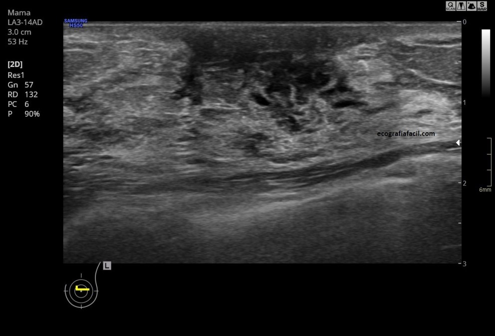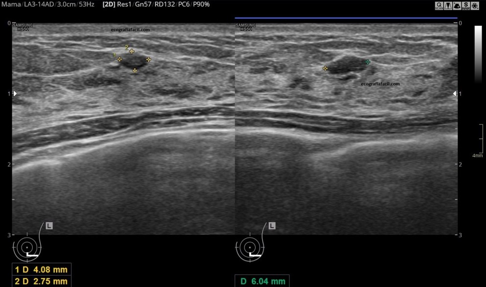 What we see semiologically comparing images 3 and 4, is an enlarged structure, more variegated and where we observe that the glandular tissue is greatly increased, also increased in its hyperfrequency, even, the lesion seen in image 3 is seen as blurred in image 4 … all those changes that are clearly observed in the last image.