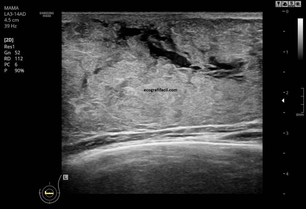 Conductos dilatados, anecoicos, distribuidos por todo el tejido hiperecogénico típico de esta situación de la lactancia.