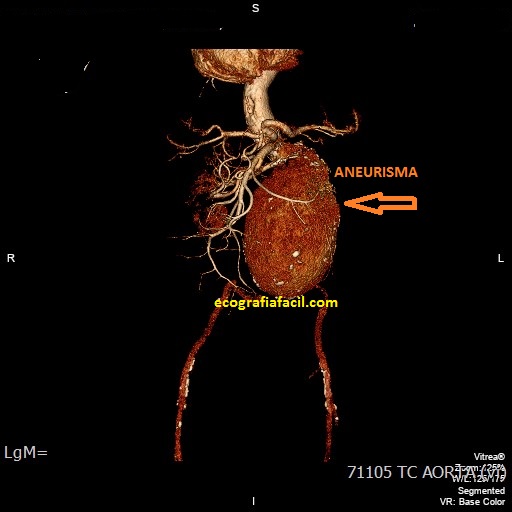 – Ecográficamente se observa una aorta dilatada por encima de los 3 cms. de diámetro con el flujo sanguíneo comprometido o no.Te dejo un caso clínico en imágenes con sus reconstrucciones 3D de TAC.