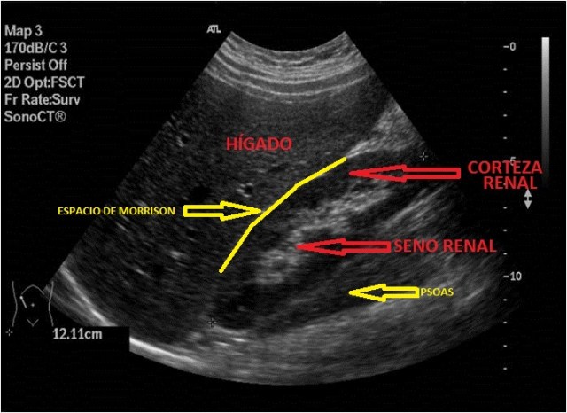a.- En el receso hepatorrenal o Espacio de Morrison: