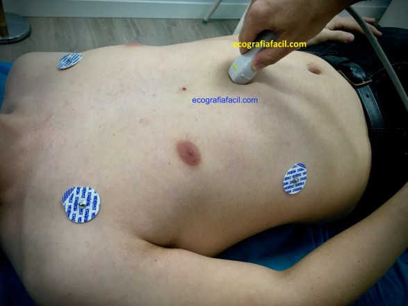Si es posible con el paciente en decúbito supino colocamos la sonda (baja frecuencia) en el epigastrio, ligeramente desplazada hacia el lado derecho y “apunta” hacia el hombro izquierdo (hacia craneal, izquierdo y posterior), con lo que veremos el corazón desde abajo a través de la ventana que nos hace el hígado. Desde aquí vamos a conseguir imágenes en “cuatro cámaras subcostal” “eje corto subcostal” y “plano de la vena cava inferior”. También es posible obtener un plano “cinco cámaras subcostal”. Todo depende de lo tangencial que situemos la sonda a la piel.