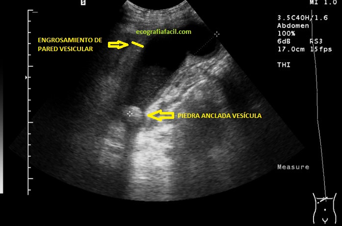 Colelitiasis, Engrosamiento pared vesicular, Barro Biliar (Contenido ecogénico).