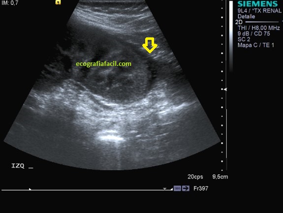 Ecográficamente veremos una línea ecogénica fija a la papila con ángulo agudo en forma de V. En casos agudos esa línea ecogénica flota y en los crónicos esta línea es más grosera, plegada y fija.