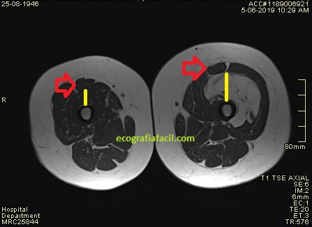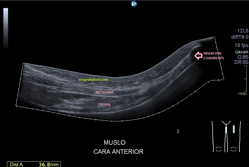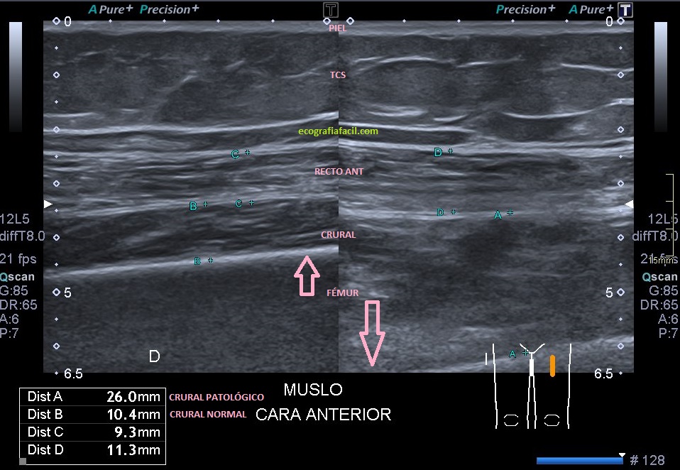 In ultrasound, the first thing I see when performing the exploration in the axial section of the middle third is a striking difference of the ecoarchitecture of the middle third of the affected femur. In this case, what is observed an increase in the anteriorvolume of the Crural Muscle with respect to the Anterior Rectus. This increase in caliber is throughout the course of the anterior femur, with which the affectation is from proximal to distal of the muscle previously spoken.