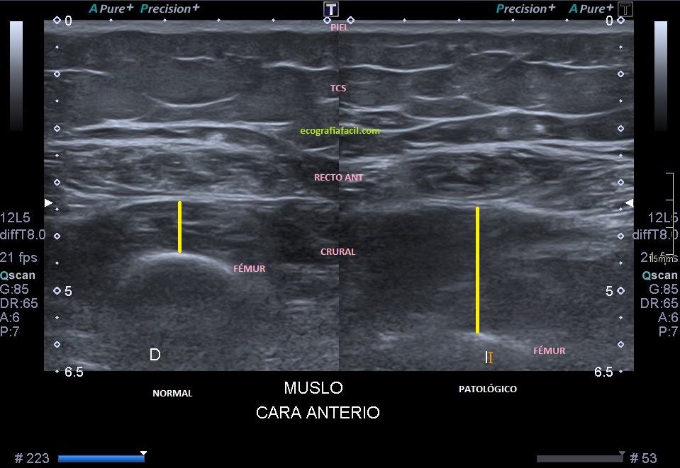 En la ecografía lo primero que veo al realizar la exploración en el corte axial del tercio medio es una llamativa diferencia de la ecoarquitectura del tercio medio del fémur afectado. En este caso lo que se observa a ojo de buen cubero es aumento del volumen antero posterior del Músculo Crural con respecto al Recto Anterior. Ese aumento de calibre es en todo el recorrido del fémur anterior, con lo que la afectación es desde proximal a distal del músculo citado anteriormente.