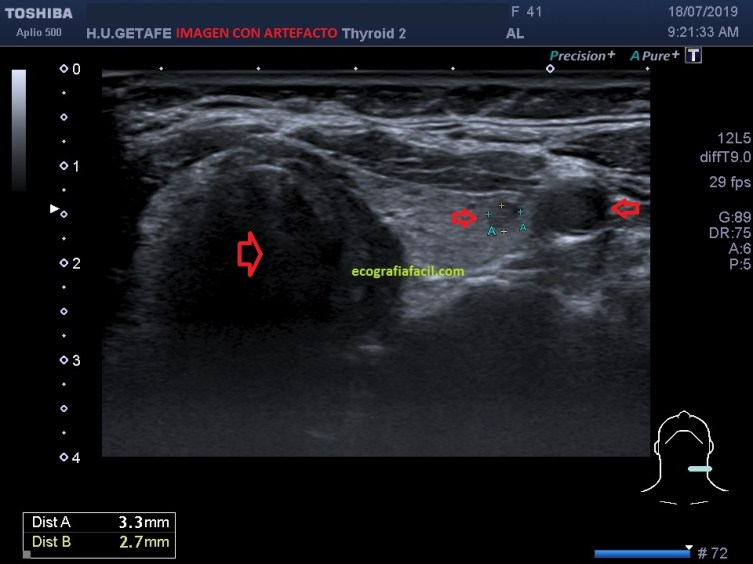 ¿Pero cómo este artefacto degrada la imagen?, como una imagen vale más que mil palabras, te pongo dos imágenes de un corte del lóbulo tiroideo izquierdo, donde encontramos un nódulo pequeño. Observa y sobre todo presta atención a las flechas rojas.Son zonas de conflicto.
