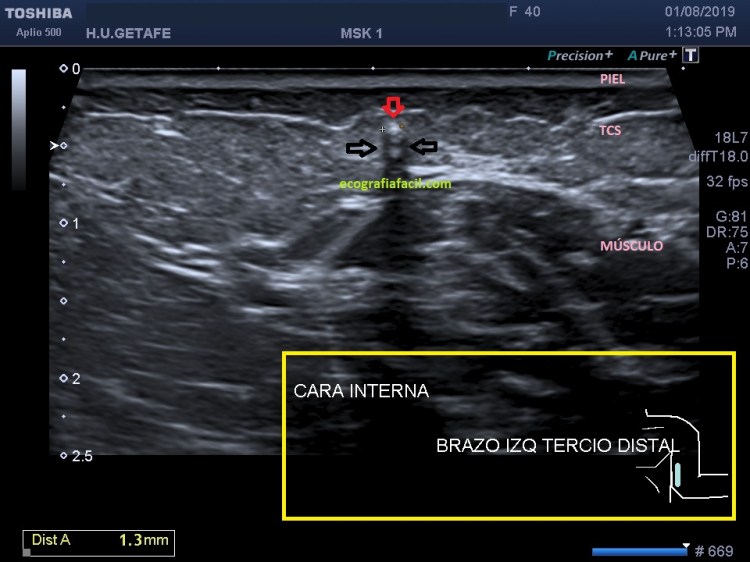 What we have to look for is a hyperechogenic and elongated image. We will look for it in the subcutaneous (hypoechogenic) cell tissue. If we do not find it in its normal location, we must «search for it», and finding it is not easy.