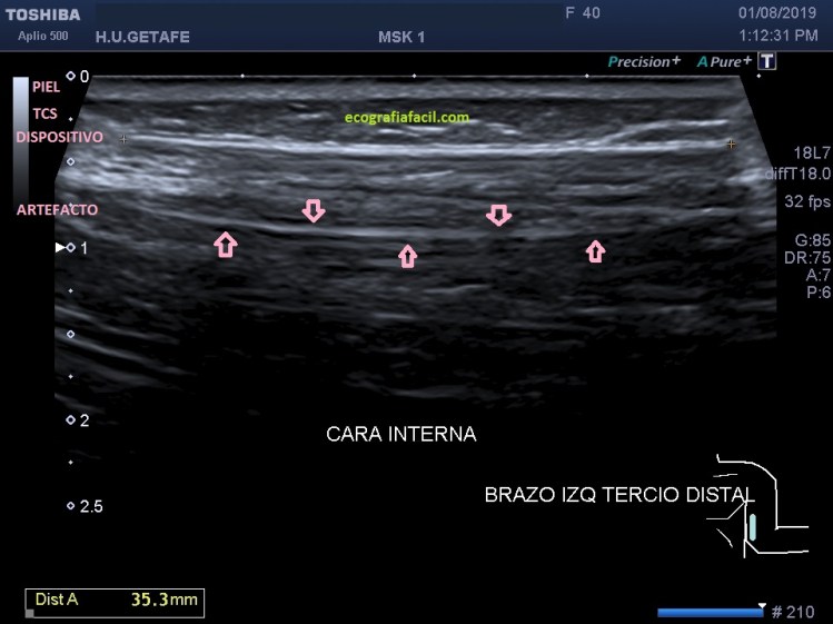 Te recomiendo que busques en axial respecto del eje largo del antebrazo, el corte longitudinal hará que confundas las líneas hiperecogénicas de los septos lineales con la ecoestructura alargada e hiperecogénica del dispositivo.