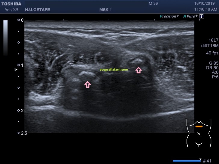 Se evidencia una imagen donde el apéndice xifoides parece terminar en dos, bífido. Lo puedes apreciar como dos imágenes hiperecogénicas señaladas con flecha rosa, a niveles distintos, la izquierda más anterior que la derecha. En el corte longitudinal de ambas terminaciones observamos esto (imagen 4 y 5)