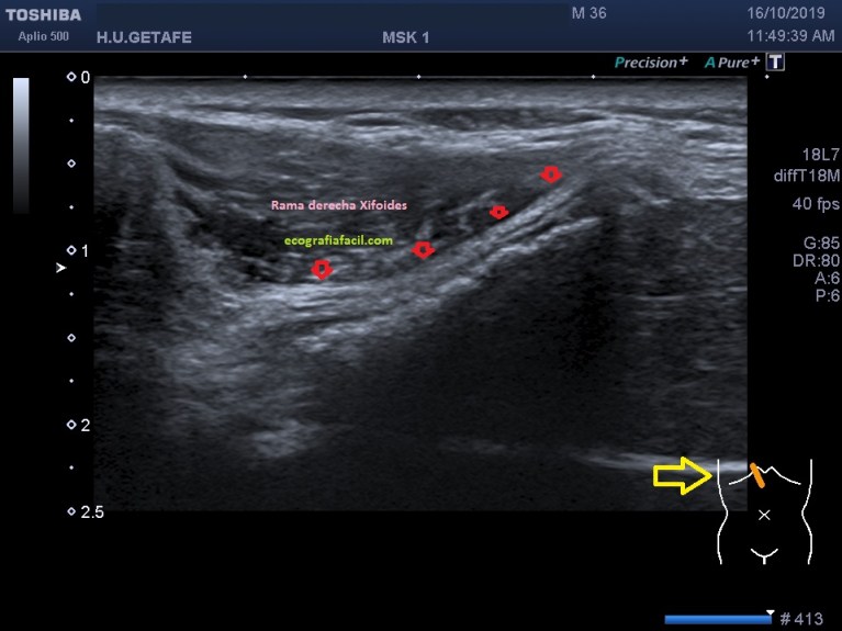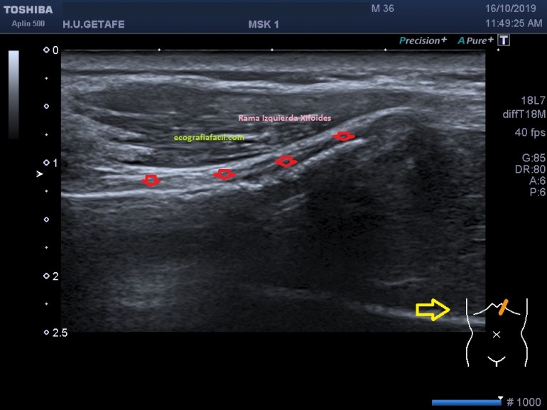 Cuando el/la paciente llega a la sala exploramos la zona de interés y solemos encontrar que el apéndice xifoides está posicionado hacia anterior como vemos en la imagen 1. Lo ideal es realizar localización en corte axial para poder descartar una apéndice bífido, es una anatomía variable, en este caso te presento un apéndice cuya disposición es bífida, puedes repasar aquí los diferente tipos que podemos encontrar.