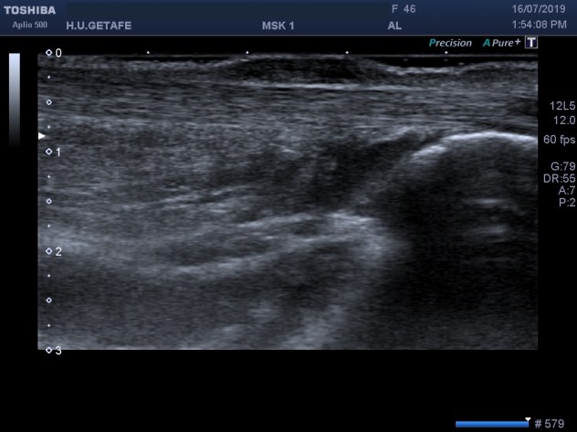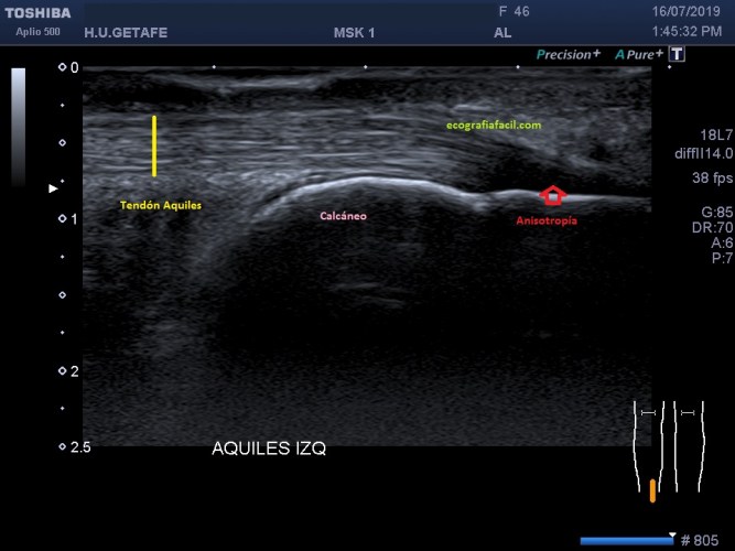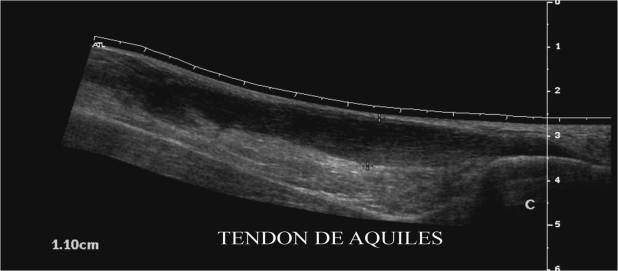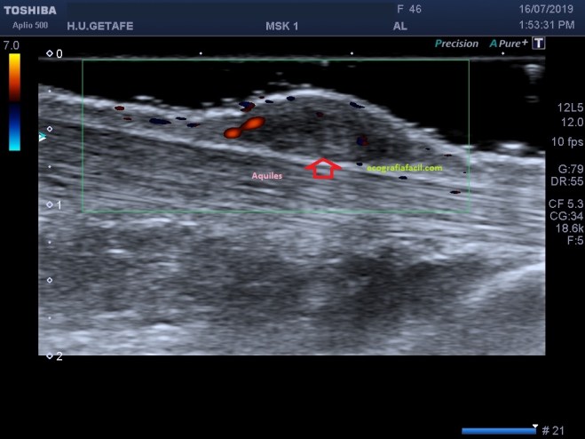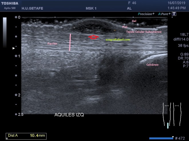La exploración del Aquiles estándar en este caso revela un aquiles perfectamente normal, hiperecogénico, sin aumento de calibre. Existe a cinco centímetros de la inserción una lesión ovoidea, superficial, heterogénea, extramuros del Aquiles, justo debajo de la piel, dolorosa, no capta señal doppler. Grasa de Kager conservada.