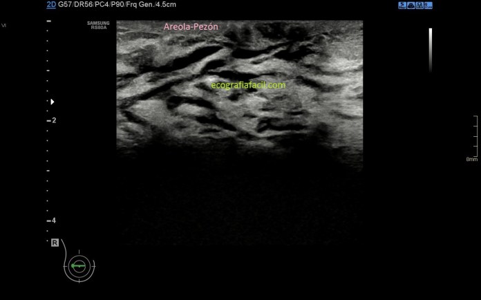 Al pezón llegan los conductos galactóforos, el estudio de esa anatomía específica de la ecoarquitectura del área areola-pezón es nuestro objetivo este post. Vamos a ver mucha variedad, voy a intentar resumirla mucho. Cuando estudiamos lo región retroareolar podemos ver una anatomía ecográfica donde apenas encontramos conductos galactóforos, están vacíos, también podemos ver esos conductos galactóforos llenos de líquido, eso es una ectasia ductal, que puede ser unilateral, aunque normalmente deber ser bilateral.