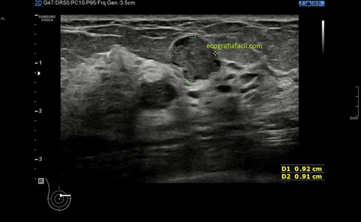 Cuando esa apariencia ecográfica del conducto no es anecoica y es hiperecogénica, es decir, cuando ese contenido es ecogénico debemos poner nuestras orejas de punta…tendremos que ver si ese contenido es móvil, es decir, si se mueve dentro del conducto, si es un conducto o varios y sobre todo, debemos estar muy atentas para ver si ese contenido que pudiera ocupar ese conducto es nodular, si así lo fuere podríamos estar delante de otra patología muy importante dentro de la ecografía de mama que es el Papiloma.