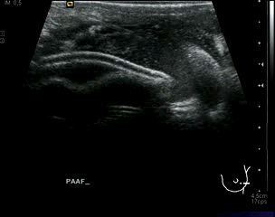 En la imagen siguiente puedes observar los tubos de drenaje en forma ecográfica de «cuerpo extraño», tubular, hiperecogénico, dentro del absceso.