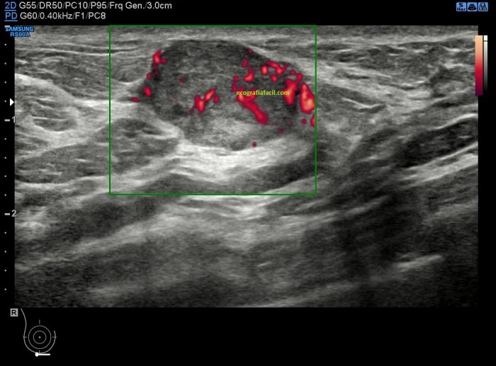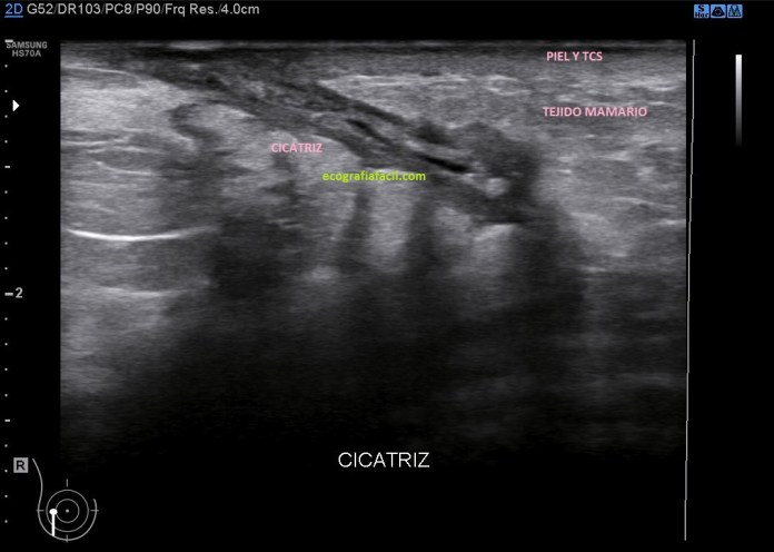 En la primera revisión tras cirugía nos encontramos una lesión cicatricial con una moderada cantidad de líquido de aspecto hipoecogénico, es irregular, la paciente tenía molestia en la zona, pero no presentaba fiebre.