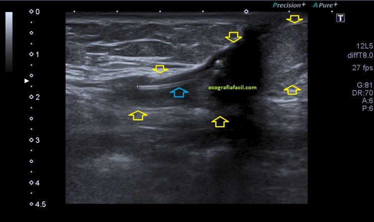 En ocasiones, como en la imagen superior, el seroma, convertido en absceso por la presencia de material quirúrgico que quedó en la herida quirúrgica. La colección se torna en hipoecogénica, flanqueado por flechas amarillas, el cuerpo extraño, que un trozo de drenaje que quedó atrapado al extraerlo está marcado por una flecha azul y medido, siendo su ecoarquitectura, hiperecogénica, curva y tubular.