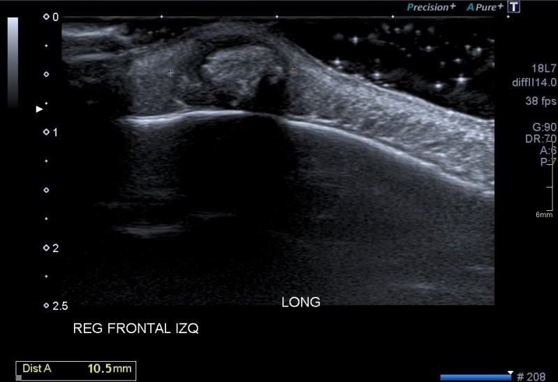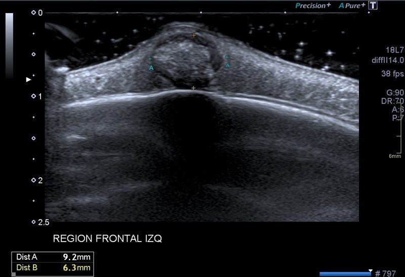 Lo segundo es localizarlo perfectamente en su ubicación, y ver a qué planos pertenece, si está tocando o no la estructuras que están a su alrededor. En el caso de esta lesión vemos que está en justo debajo de la piel, en el escaso espesor de tejido celular subcutáneo que existe en la región frontal, que es donde la mujer tenía este tumor.