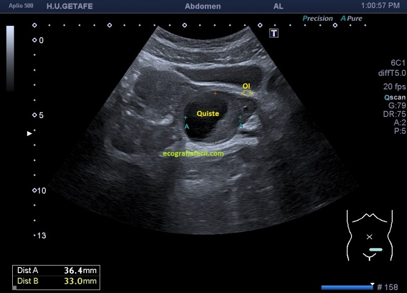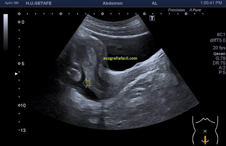 El estudio transcurre normalmente, pero al llegar a la pelvis y nada más llegar observo una imagen que me llama la atención en el teórico lugar del anejo izquierdo. Estudio la vejiga, que no tiene ningún hallazgo significativo, con una media repleción y acto seguido me centro en el útero y los ovarios.