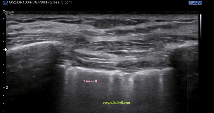Líneas B.Esta visualización del espacio intercostal indica Líneas B (flechas rosas), patología de diversa índole, normalmente, por la pérdida de la aireación normal en el contexto del síndrome intersticial y la presencia de tejido inflamatorio y/o líquido en esa región del pulmón que permite el paso de los trenes de ultrasonidos produciendo este tipo de imagen que es también otro artefacto, esta vez en cola de cometa.