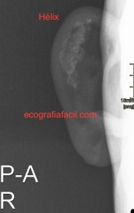 En el caso de este paciente, presentaba una imagen hiperecogénica que ocupaba tanto el Hélix como el ante-hélix, con una sombra acústica posterior bastante llamativa, que podía justificar la rigidez. La imagen era muy llamativa. Mira: