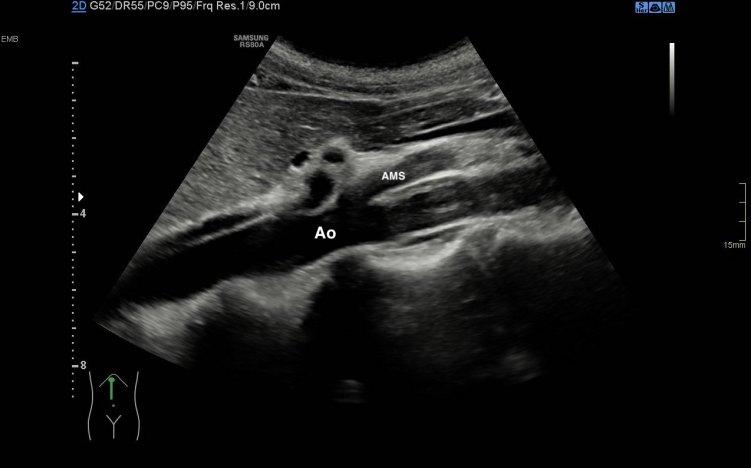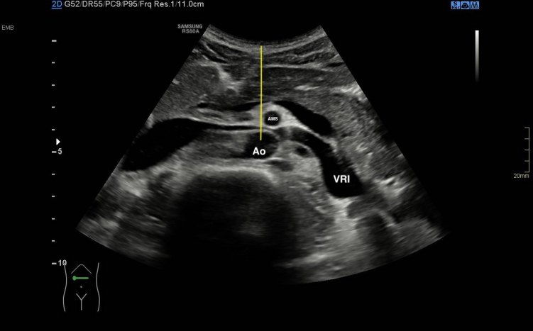 Es momento de estudiar el corte en sagital o longitudinal ahora toca ver el ángulo que forman Ao y AMS, ese ángulo determinará la posible causa de la patología del paciente y si tiene valores anómalos el radiólogo podría diagnosticar un síndrome del cascanueces.