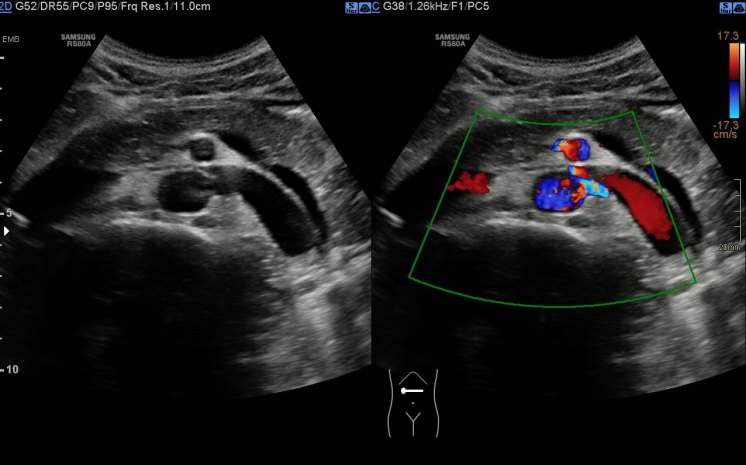 Quiero que te fijes en el detalle de la imagen 3. Justo en la pinza que provocan la AMS y la AO, donde comienza la dilatación de la VRI, encontramos un defecto en el Doppler color, provocado por una cambio en la velocidad de paso provocado por el estrechamiento, lo señala la flecha amarilla.