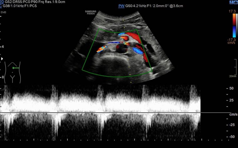 En la imagen 2 ponemos la misma imagen y la estudiamos con Doppler con el recurso dual para doblar la imagen.