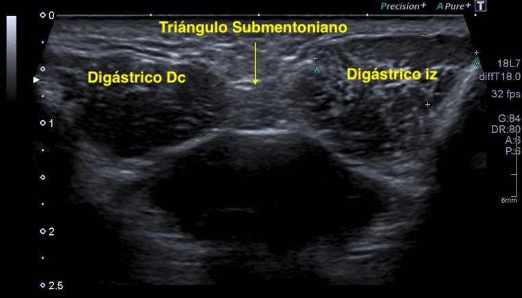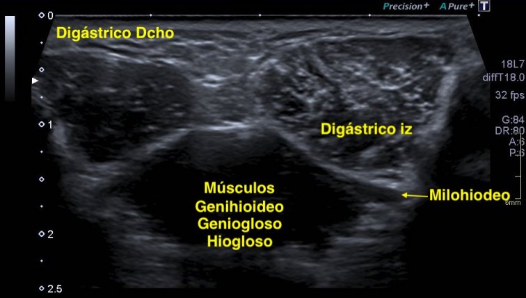 Si colocas la sonda en el mentón, en axial vas a encontrar este músculo Digástrico, que se verá muy bien, superficial, en un plano intermedio tendrás el músculo Milohiodeo y en la profundidad los músculos Geniohideos, Geniogloso y el Hiogloso…Mira: