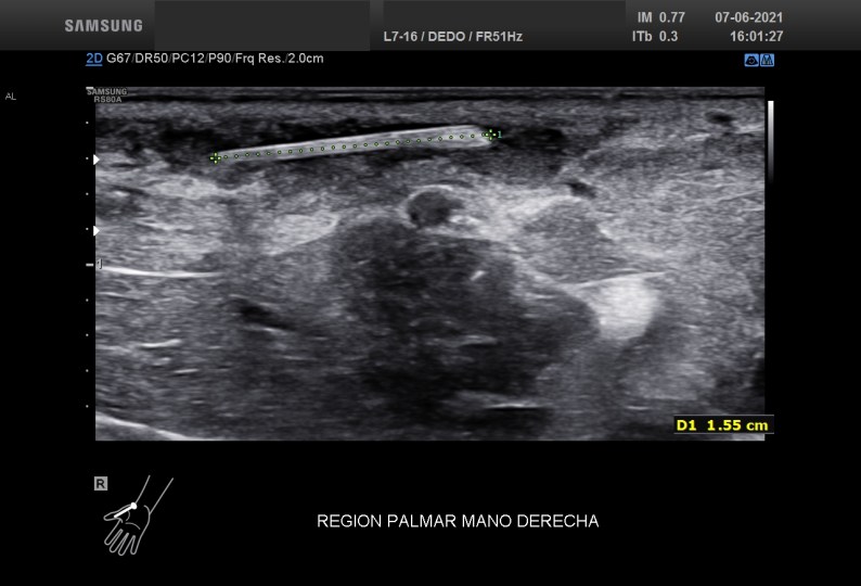 Para que te puedas hacer una idea del tamaño de la espina de la palmera, te muestro esta imagen que demuestra un tamaño aproximado a 1,5 centímetros de longitud. Lógicamente también realicé la medida en eje corto y luego para finalizar, realicé una medida muy valiosa en caso de que estos cuerpos extraños deban ser extraídos y que es la distancia que existe desde la piel hasta el objeto en cuestión.
