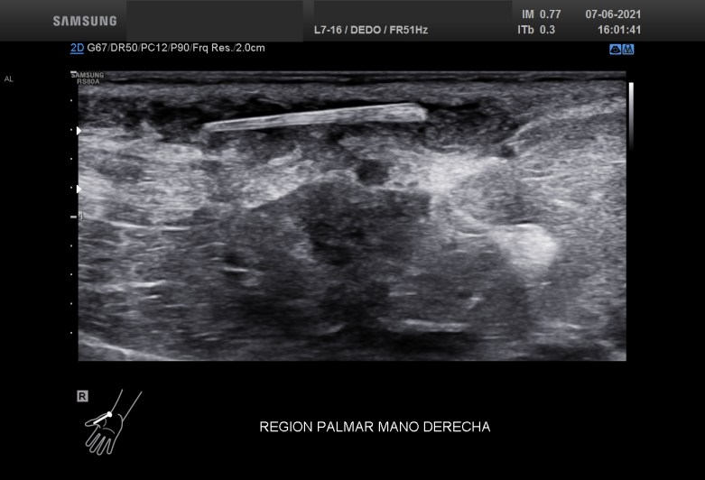Es el caso de este trabajador de jardinería que presenta una zona indurada de meses de evolución, dolorosa, con rubor focal y hasta el momento sin fiebre. No tiene supuración y la piel está conservada. Refiere haberse clavado en la zona en cuestión una espina de palmera ,meses atrás, pero que parece que pudo extraer, la herida cerró normalmente, pero la evolución de la molestia le hace acudir al especialista que recomienda exploración ultrasonográfica.