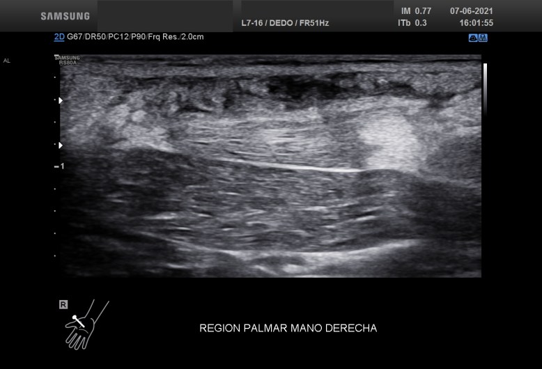 La distancia desde la piel corresponde a 0,23 cms. El paciente fue remitido al cirujano y fue intervenido para desalojar el cuerpo extraño.