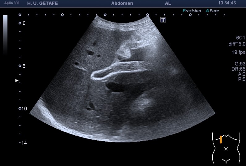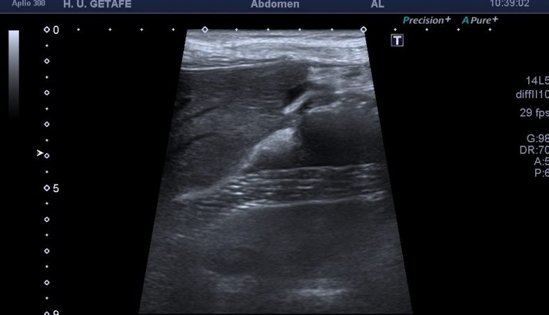 Dentro de los estudios del abdomen estudiamos siempre la vía biliar intra y extrahepática, lo he contado en Post anteriores y está más que revisado. El caso de hoy es distinto. Dentro de un estudio de abdomen exploramos la región de la vía biliar con el objeto de localizar y certificar el posicionamiento no migrado de una endoprotesis biliar.
