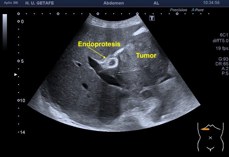 El estudio certificó que el Stent estaba bien posicionado y que el avance de la enfermedad mostraba una gran masa sólida hepática que sería la responsable de la nueva aparición de la ictericia.