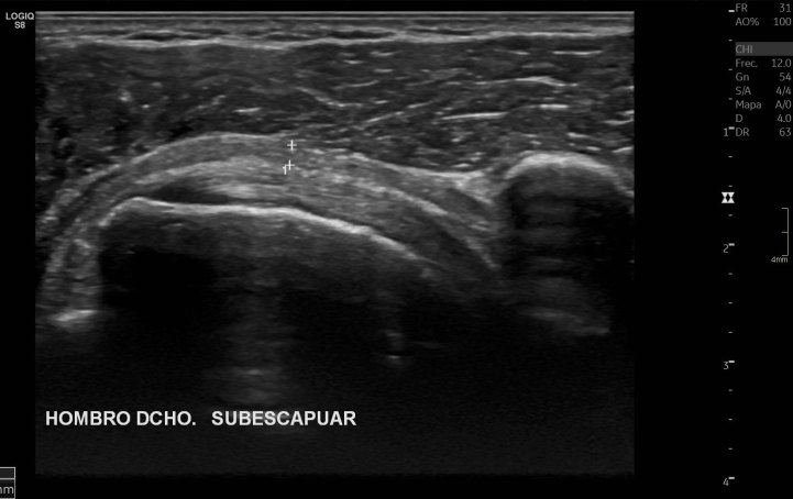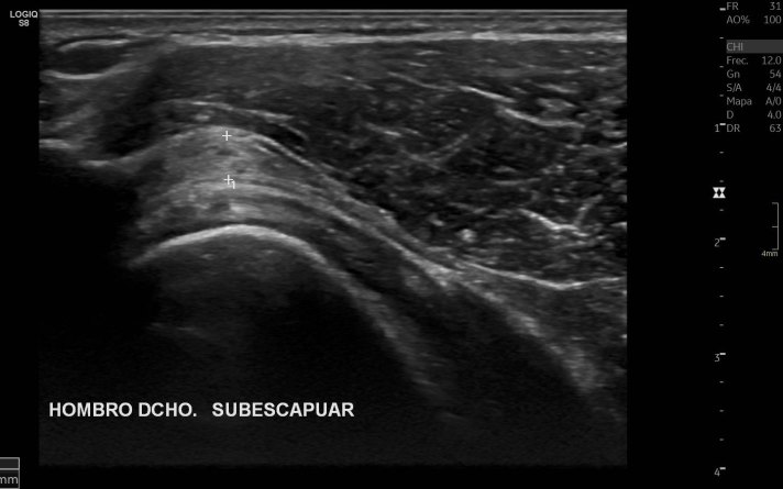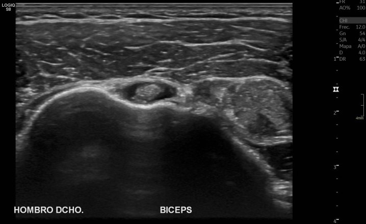 Bíceps con líquido en la vaina, el tendón está conservado, en su estructura y en su ecogenicidad.