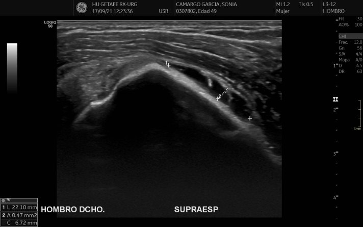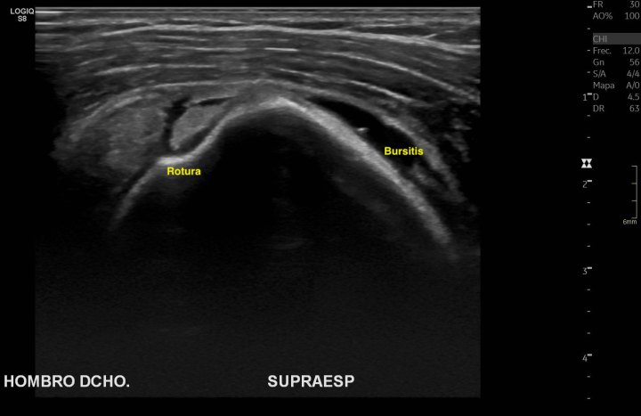 Tendinopatía del supraespinoso una rotura parcial, la mayoría superficial pero que probablemente corresponde a una de espesor total con recorrido anfractuoso afecta al tercio medio de las fibras. En el corte longitudinal de la imagen 5 puedes ver una de las más plásticas imágenes que he visto, una rotura del supra, con su continuación al la BSASD, corte que siempre debes hacer. Una imagen, preciosa. Buenas noches.