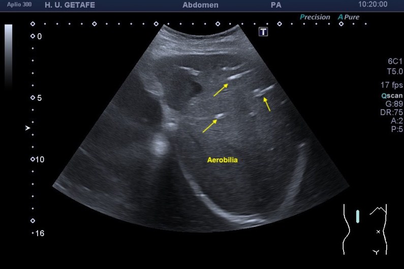 Ecográficamente vamos a ver como los trayectos de las vías biliares rellenos de una imagen hiperecogénica característica con una sombra posterior «sucia». En la medida que la afectación haya hecho mella en el árbol bronquial, o el aire haya pasado a estos conductos.