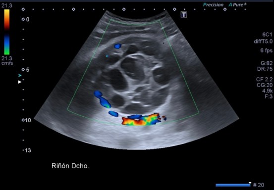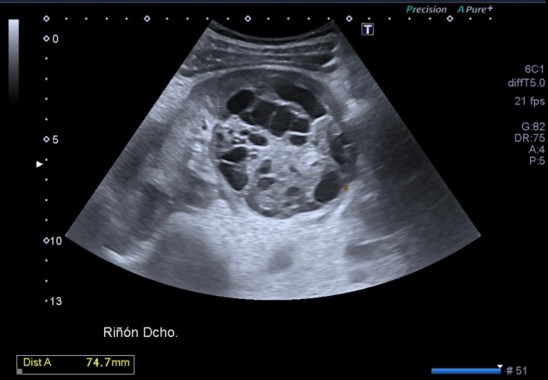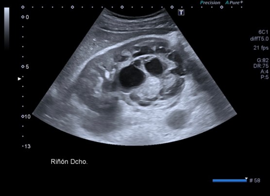 Lesión heterogénea, en el meso-riñón derecho, redonda, típica de quiste hidatídico.