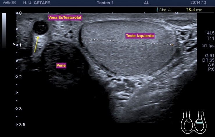 En la exploración, ambos testículos y epidídimos son de características ecográficas normales. Tiene un quiste milimétrico en cabeza del epidídimo derecho.