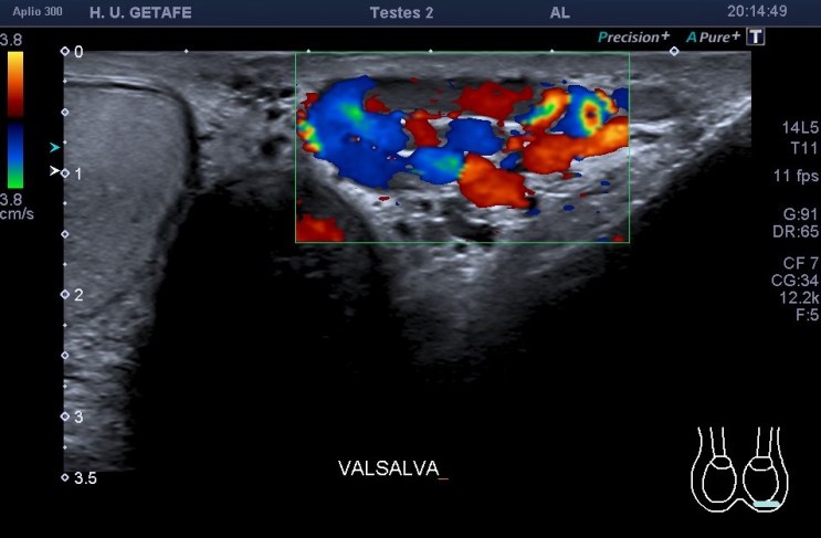 Se identifica coincidiendo con el cordón palpable en línea media de la bolsa escrotal, a nivel subcutáneo, imagen tubular de 37 x 5mm, serpinginosa de aspecto quístico con ecos en su interior que podría corresponder a malformación linfo-vascular sin poder descartar trombosis de vena superficial del escroto (mondor escrotal). El diagnóstico final fue la malformación linfo vascular